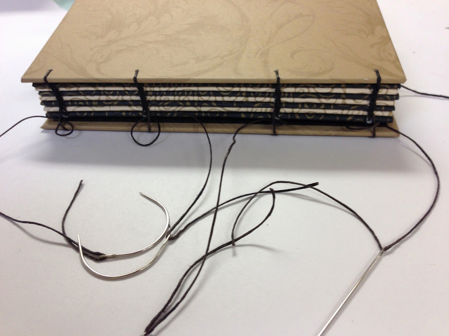 The covers and signatures were stacked in order for sewing. Two lengths of 4 cord waxed thread long enough to complete a pair of bindings were cut. If the thread is too short additional lengths of thread can be attached using weavers knots (A lesson I learned). So we could try using both curved and straight needles; one length of thread was attached to two blunt straight needles, and the other thread was attached to two blind curved needles (as seen at right).